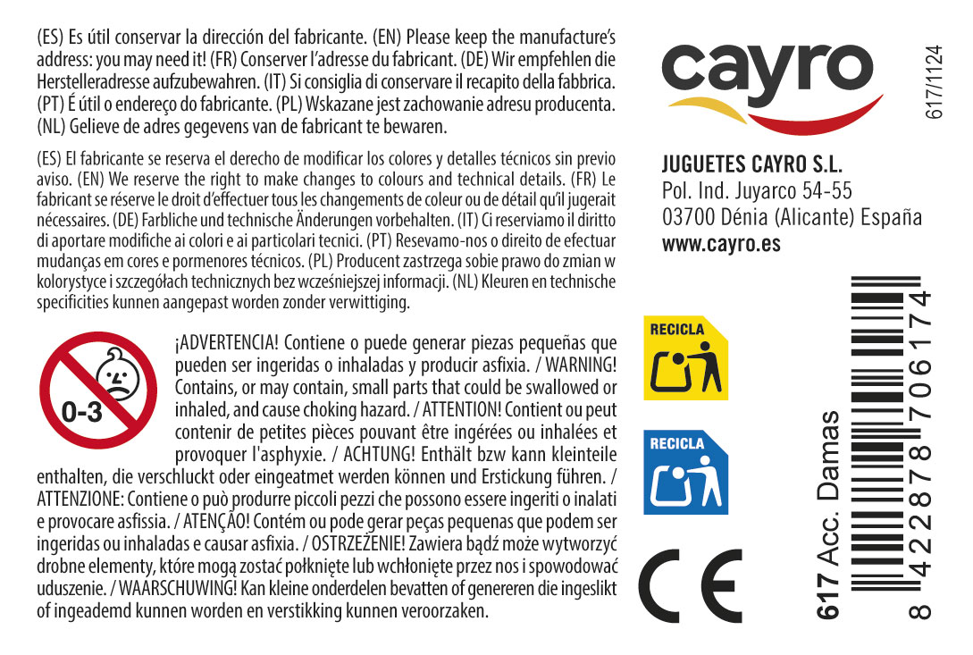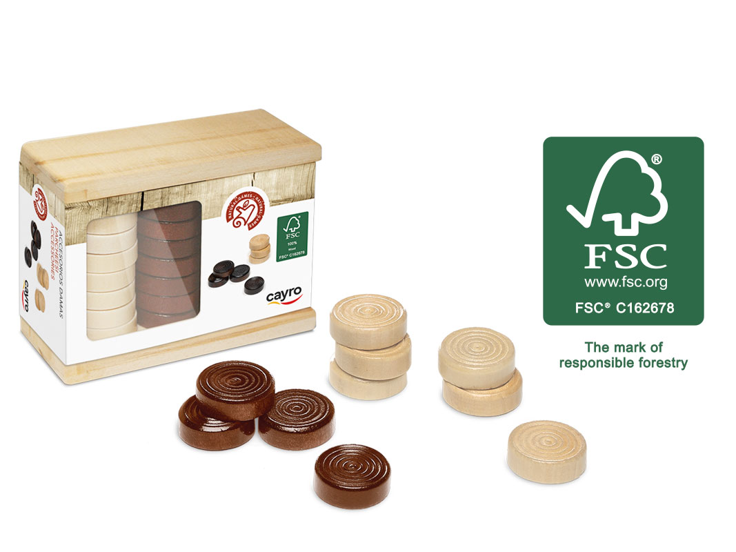 Juego de 24 fichas para las damas en dos colores de 2.5 cm de diámetro por 0.8 cm de espesor. Están fabricadas en madera y van dentro de una caja también de madera y barniz mate. Presentado plastificado con lámina de polipropileno totalmente reciclable.