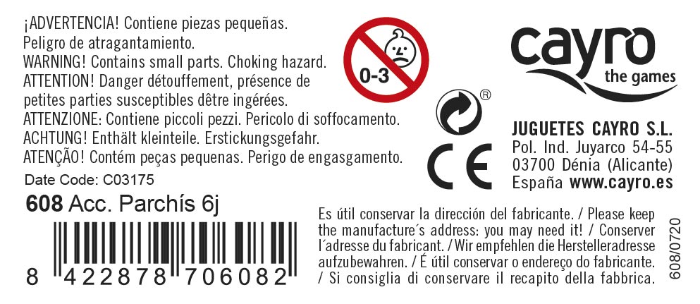 Los clásicos accesorios para jugar al parchís fabricado íntegramente en madera y con una práctica caja transparente para guardarlos, las fichas son de 1,5 cm de diámetro y 0,5cm de espesor para facilitar el agarre, los dados de 1,2 cm en madera pintada. Presentado plastificado con lámina de polipropileno totalmente reciclable.