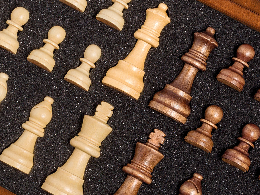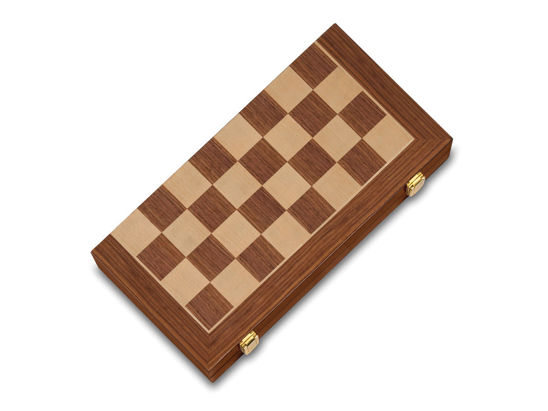 Estuche de madera plegable con tablero de ajedrez realizado en marquetería de 41,5 cm x 41,5 cm en la parte exterior barnizada con brillo y el interior forrado con fieltro con las fichas de madera sujetas con fieltro para poder transportarlas de forma correcta. Presentado en caja de cartón reciclable de diseño plus.