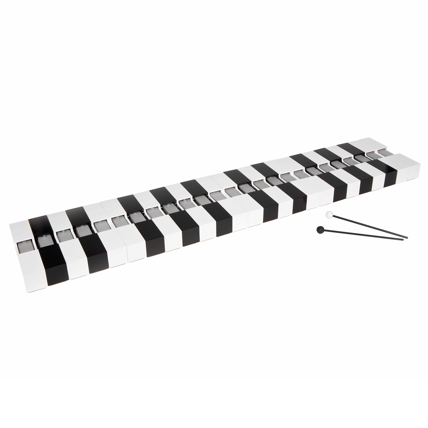 Las 25 barras de tono en este conjunto producen los sonidos de dos octavas de la tecla de «do» mayor más los sostenidos y bemoles. Incluye una baqueta dura y una suave.