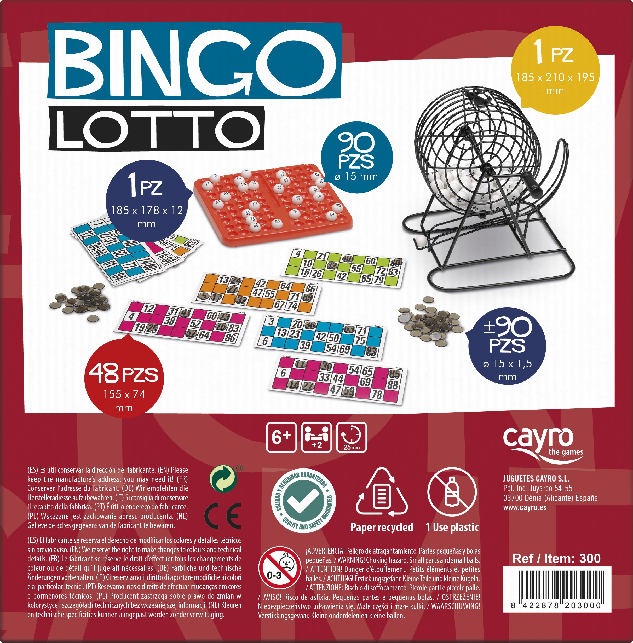 Bingo Lotto con bombo de metal y bolas. Incluye base, fichas de marcar de plástico y 48 cartones.