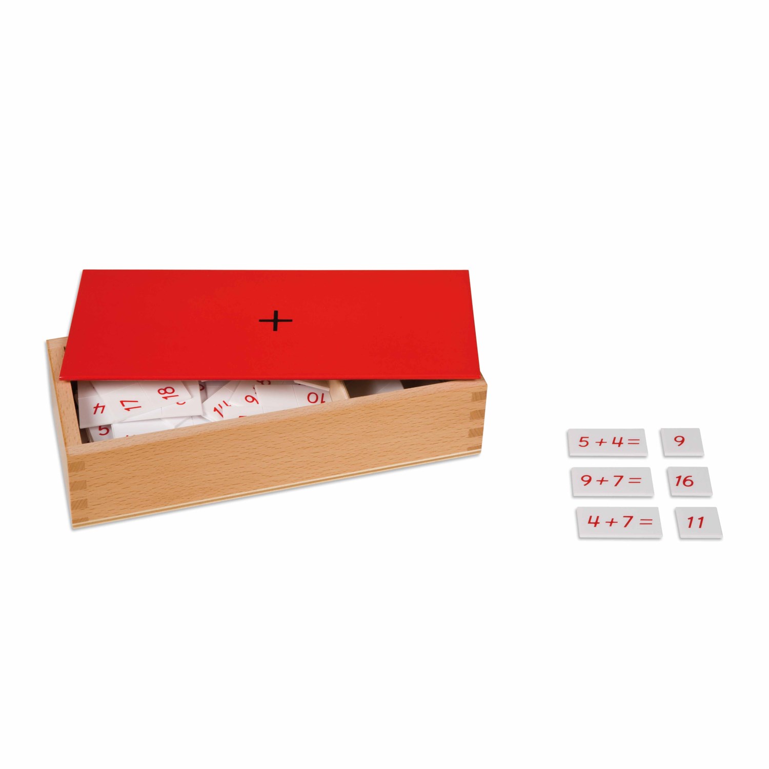Esta caja de 2 compartimentos con tapa contiene fichas de plástico, 1 juego con ecuaciones impresas en ellos y 1 juego con las respuestas que se utilizarán con las Tablas de Trabajo de Suma. Se incluyen todas las ecuaciones y sumas de los sumandos del 1 al 9.