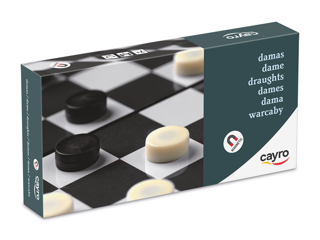 Este juego de las damas va presentado en un estuche plegable en cuyo interior se alojan las fichas con imán y por la parte exterior incorpora el diseño del juego de las damas sobre una plancha metálica para se adhieran las fichas. Por su tamaño y características podrás jugar en cualquier parte (en la playa, en el sofá, en el coche…)