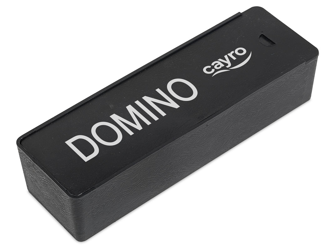 Este dominó básico, las fichas son de resina y la caja de plástico.