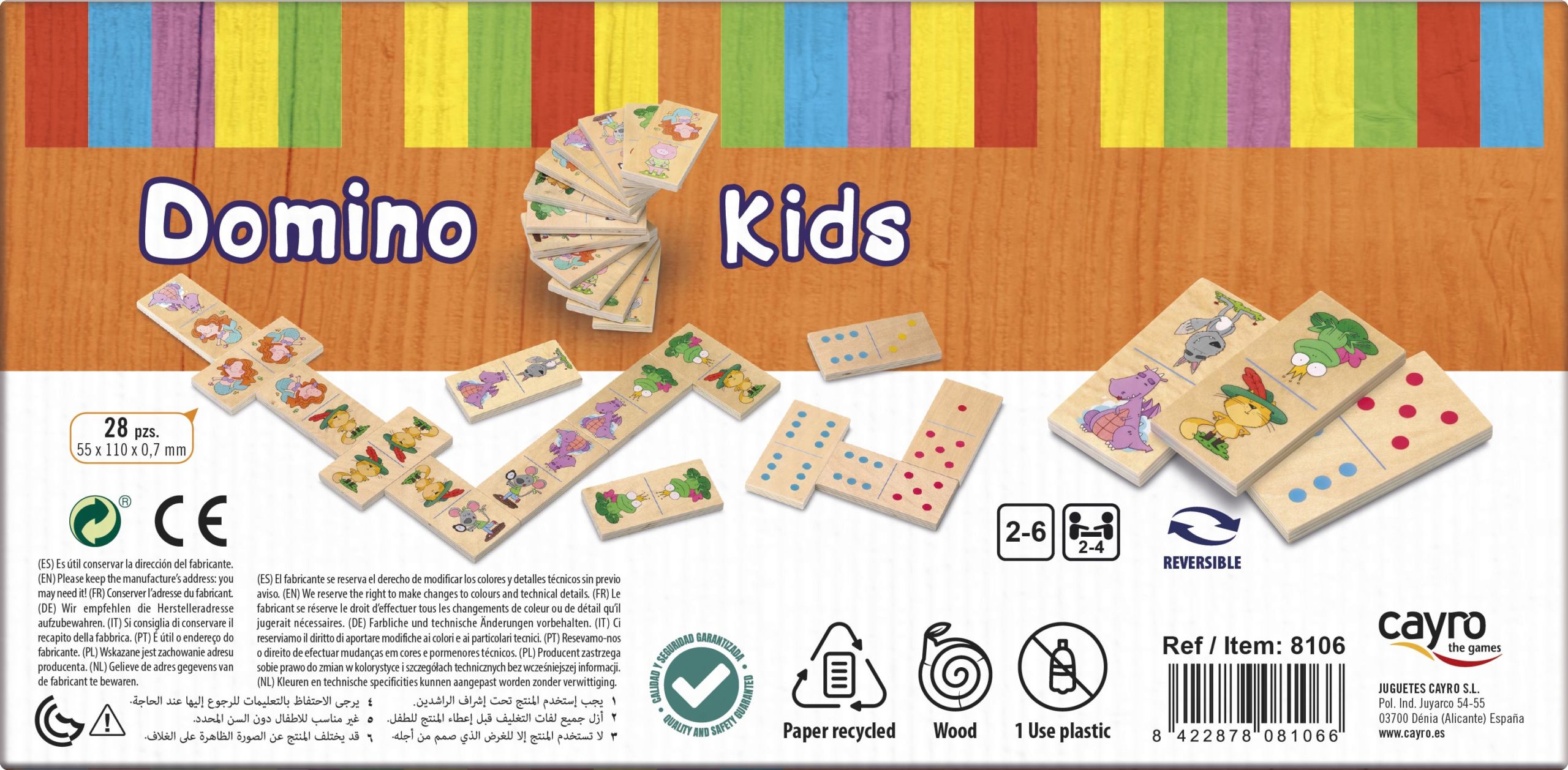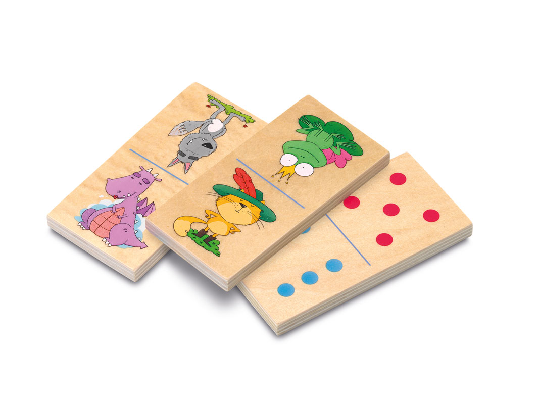 Dominó de piezas grandes fabricadas en madera, con el que podrás jugar por sus dos caras. En una deberás hacer coincidir las preciosas ilustraciones y en la otra, podrás jugar al clásico dominó de puntos. Contiene 28 piezas.