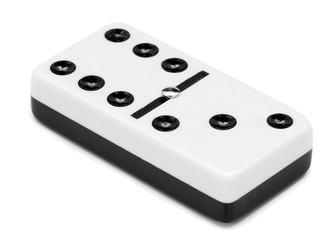 Es un dominó clásico, blanco y negro con la tache metálica. La diferencia con el resto de dominós que hay en el mercado es que la medida de sus fichas es más grande. Este cambio de tamaño facilita su manejo y la visualización de los puntos.