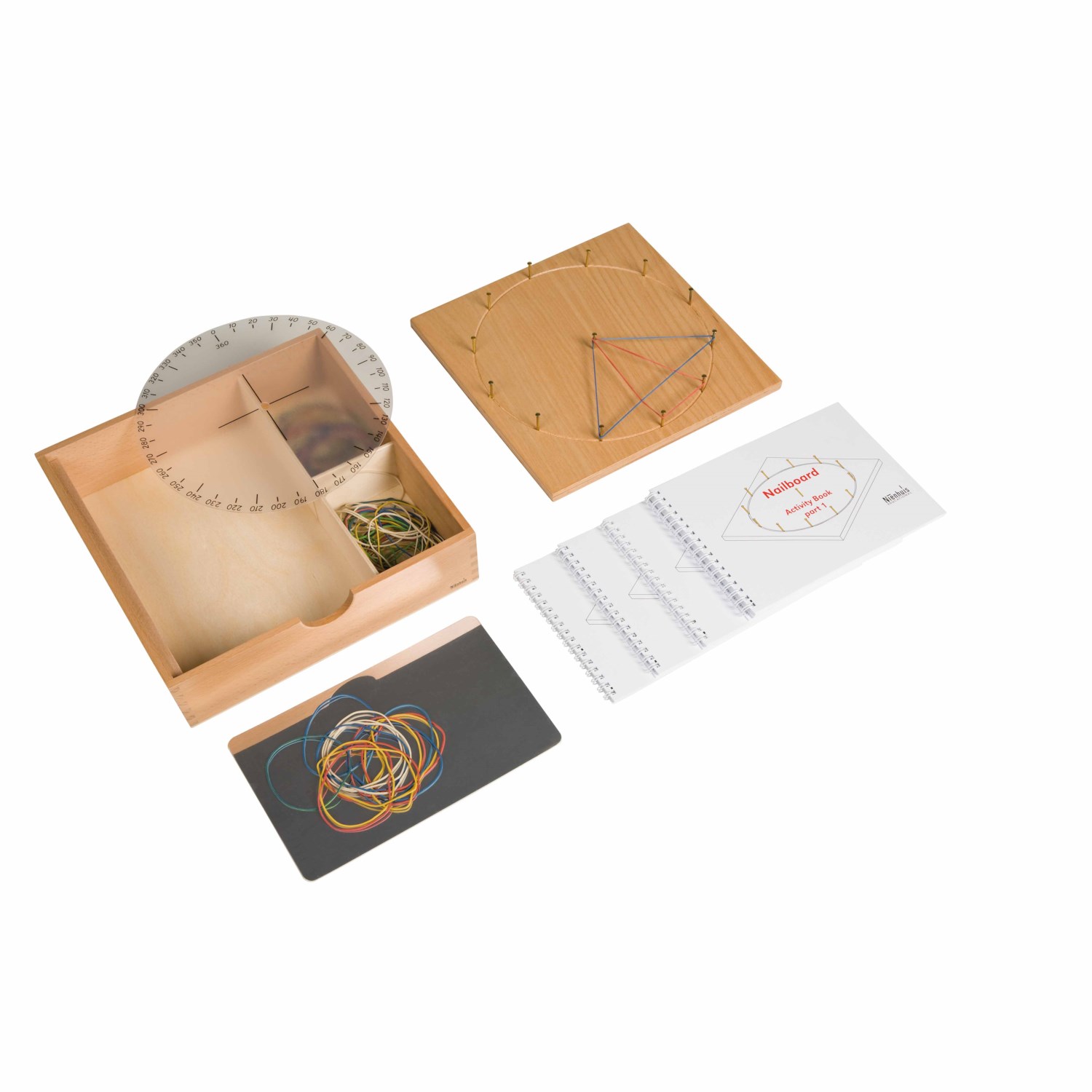 Usando El Tablero Geométrico (The Nail Board), los niños aprenden diferentes formas geométricas, ángulos, fracciones y otros patrones y cómo crearlos usando bandas elásticas. A medida que avanzan a través de los libros de actividades, exploran relaciones y conceptos geométricos más complejos y avanzados.