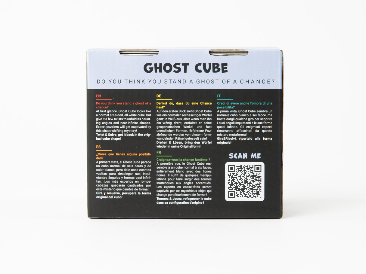 A primera vista, el Ghost Cube parece un cubo normal de seis caras y de color blanco, pero dale unas cuantas vueltas para desplegar sus inquietantes ángulos y formas casi infinitas. ¡Los más expertos en rompecabezas quedarán cautivados por este misterio que cambia de forma!