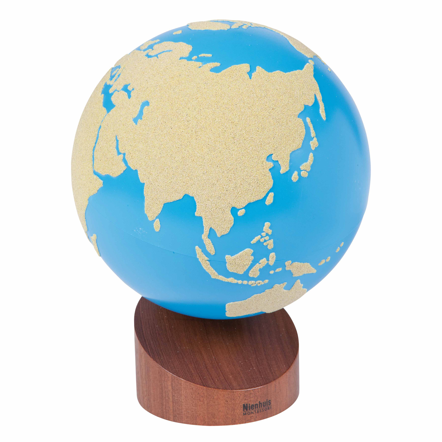 Con el Globo de la tierra y el agua, el niño recibe una impresión sensorial de la tierra y el agua. El globo tiene una superficie de arena (Como papel de lija) que representa la tierra y una superficie lisa que representa el agua. La base de madera sostiene el globo en un ángulo de 23 °, al igual que el eje de la Tierra en relación con el Sol.