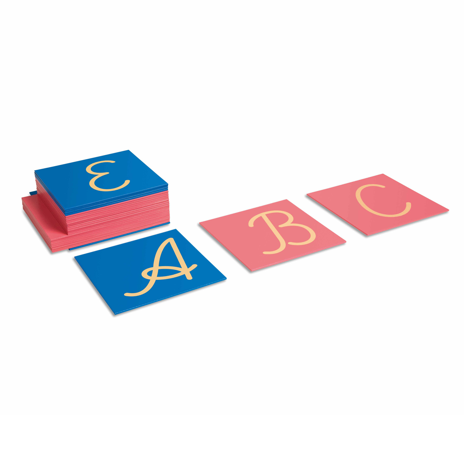 Las letras mayúsculas en papel de lija guían la mano para escribir mientras el niño traza las formas de las letras en el estilo y la dirección en que están escritas. Cada letra está en mayúscula y cursiva con las consonantes de tablillas pintadas de color rosa y las vocales en otras pintadas de azul. Cada tableta tiene un espacio a la izquierda y a la derecha para que el niño la fije con una mano mientras traza la letra con la otra.