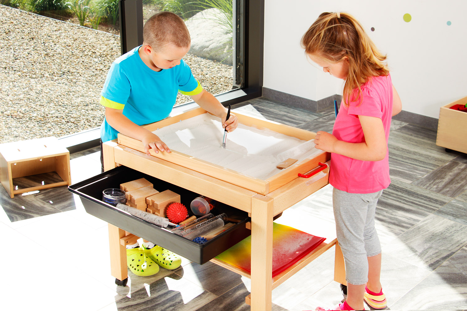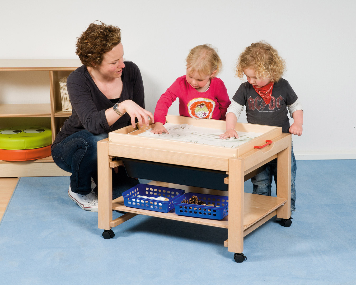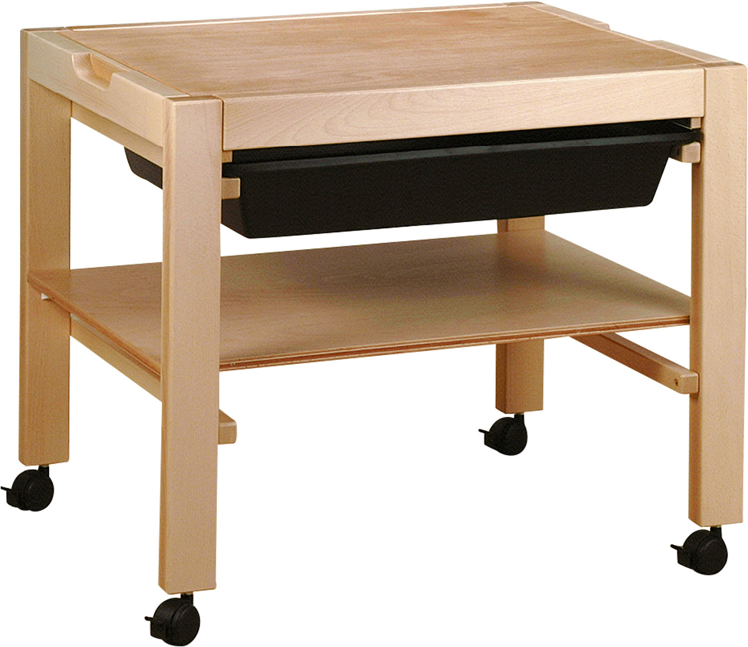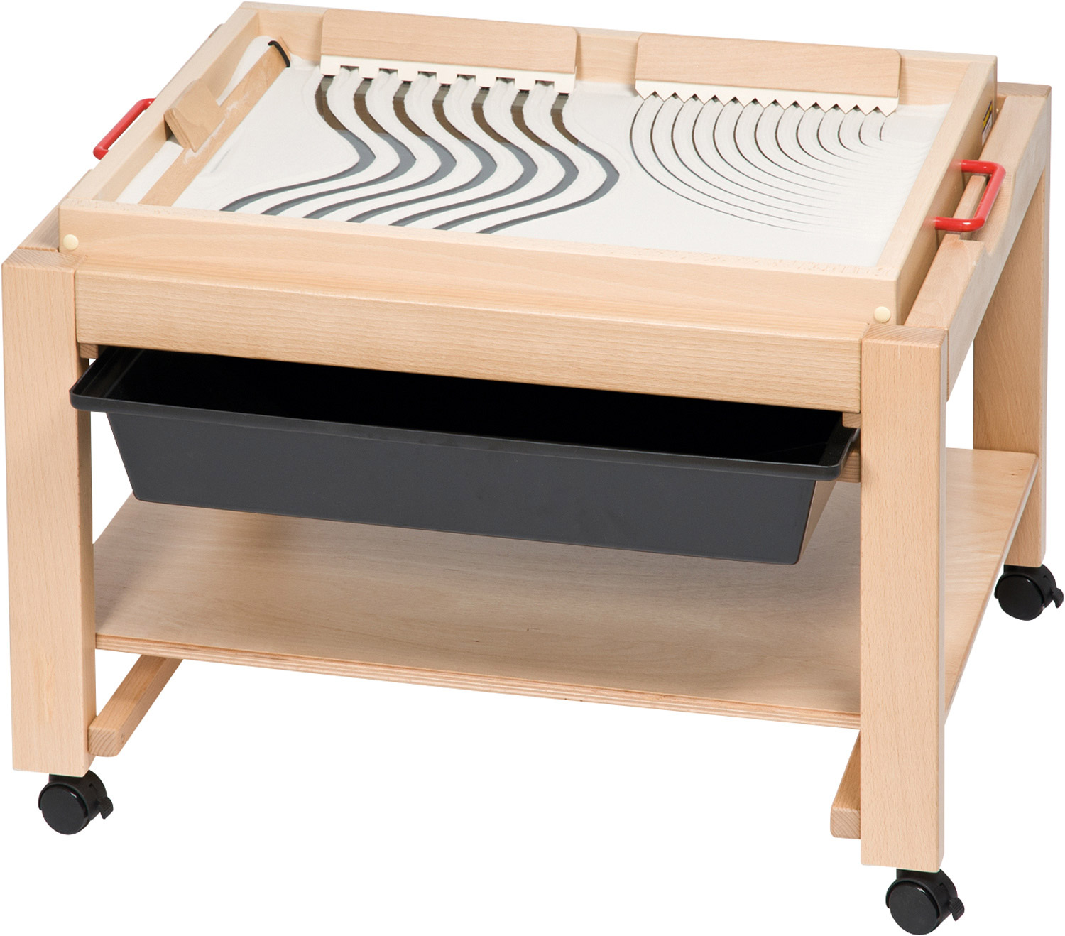 Mesa de madera maciza de haya para la Bandeja de Area. Suelo y tapa de contraplacado de haya, 2 capas de barnizado y cajón de plástico. La caja se puede extraer por los dos lados, pero queda bloqueada. Para limpiarla se puede extraer totalmente. También se puede colocar el cajón debajo de la repisa central. Sobre esta repisa caben las distintas formas de Mandalas Y las Tablas de Tacto Grandes. Gracias a sus 4 ruedas, que se pueden bloquear, la mesa permite movilidad y fijación estable a la vez. La tapa encaja sobre la bandeja de arena y la protege y ayuda a mantenerla limpia.