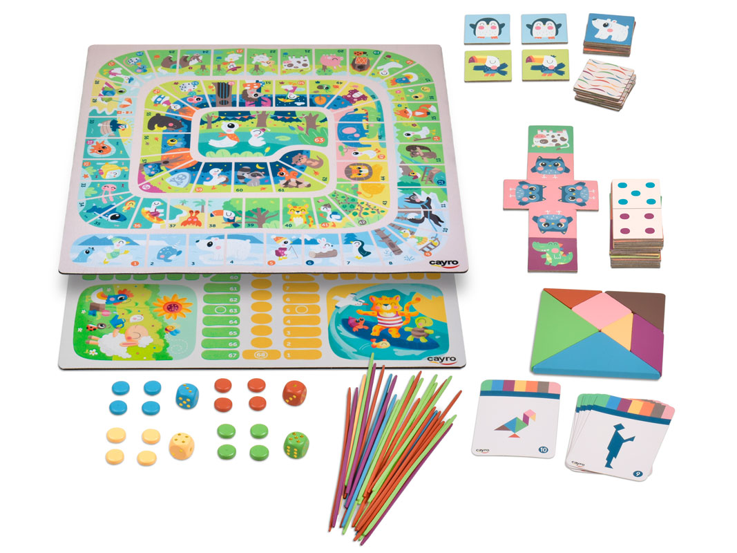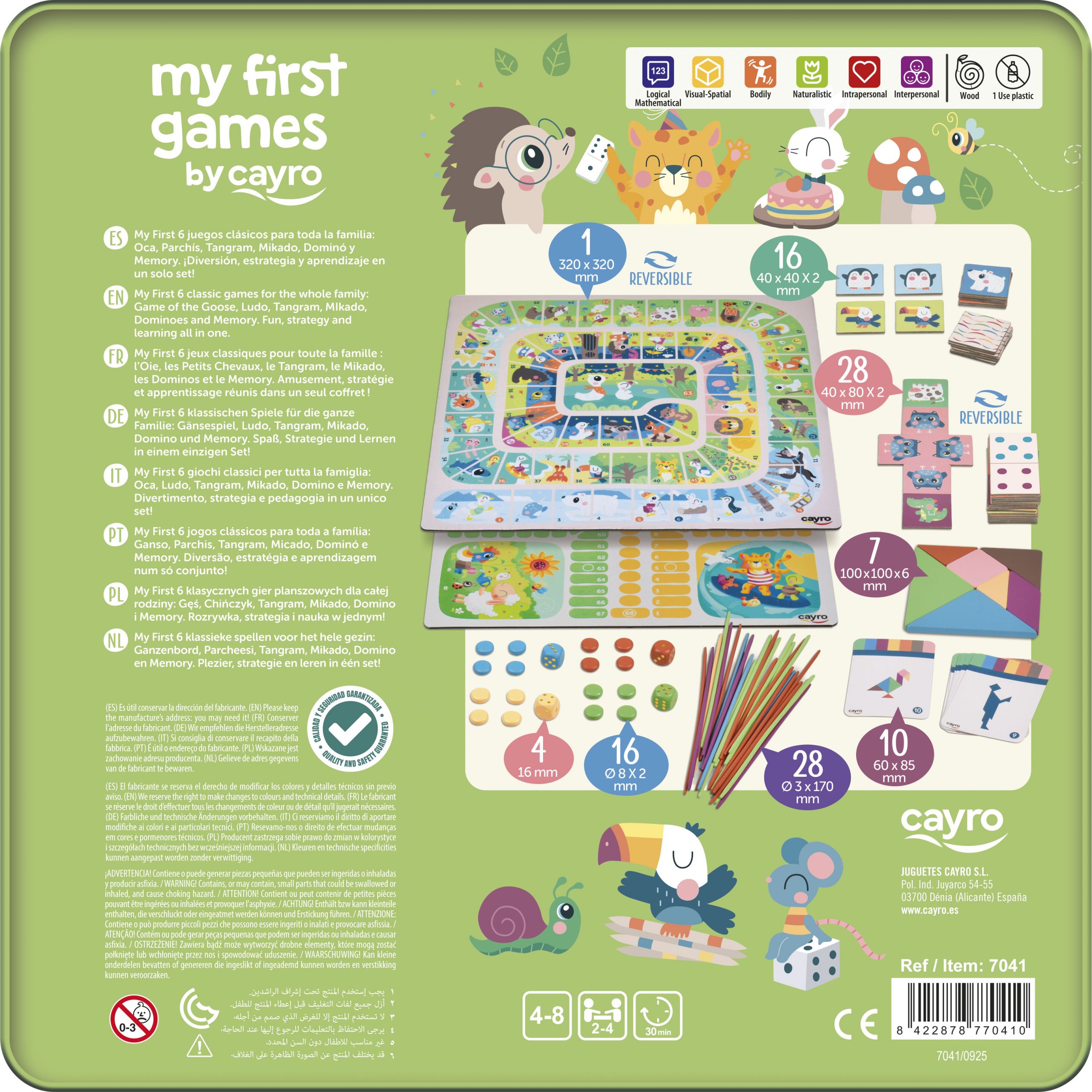 My First 6 juegos clásicos para toda la familia: Tangram y Mikado de madera, Parchís, Oca, Dominó y Memory. ¡Diversión, estrategia y aprendizaje en un set! El juego viene presentado en una caja de metal con preciosas ilustraciones y su tablero es de neopreno reversible, por lo que no se estropea como podría pasar con un tablero de cartón y si se ensucia se puede lavar.