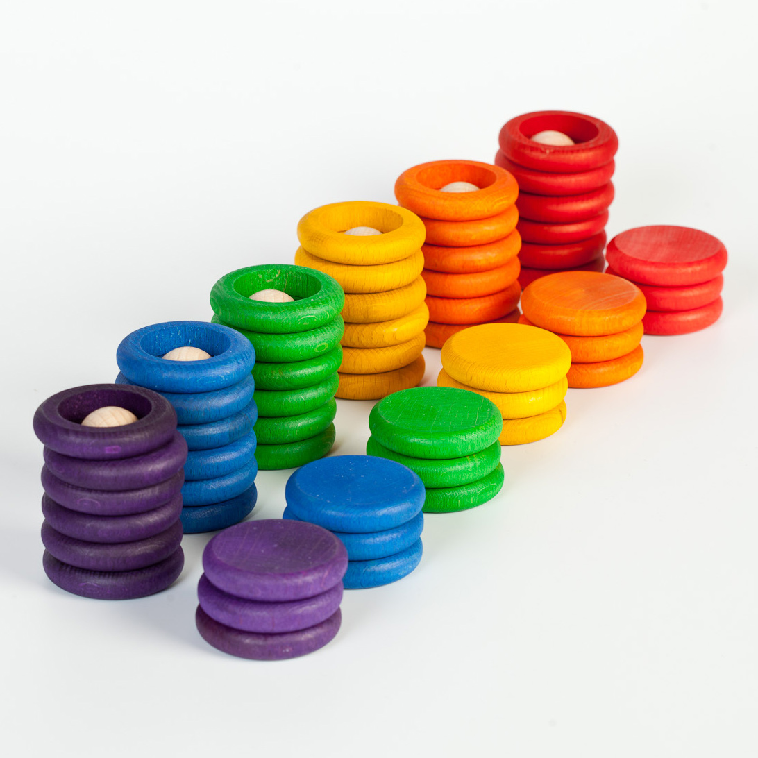 Las seis anillas de cada color permiten esconder completamente al Nin llegando a taparlo por completo, a la vez las monedas hacen de límite para hacerlo subir, cubrir a medias, descubrir del todo… Aparezco, desaparezco, me escondo, me cubro, me reencuentro… Un material sencillo que permite múltiples posibilidades de juego.
