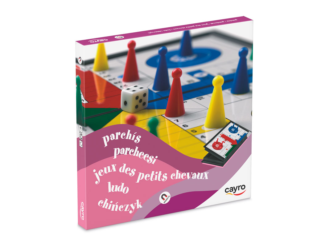 Es un tablero de parchís que se dobla por la mitad para convertirse en un estuche y así que se puedan guardar las fichas. La superficie es metálica y las fichas magnéticas, así que junto a su reducido tamaño lo hacen ideal para viajes. Podrás jugar en movimiento y no se te caerá ninguna ficha.