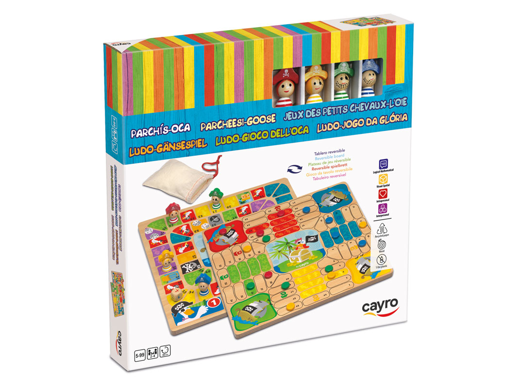 ¡Juega al parchís y a la oca con los más intrépidos piratas! Con este tablero reversible y sus peones de madera, podrás jugar a la oca o a una versión simplificada (con menos casillas) del parchís según el lado que escojas.