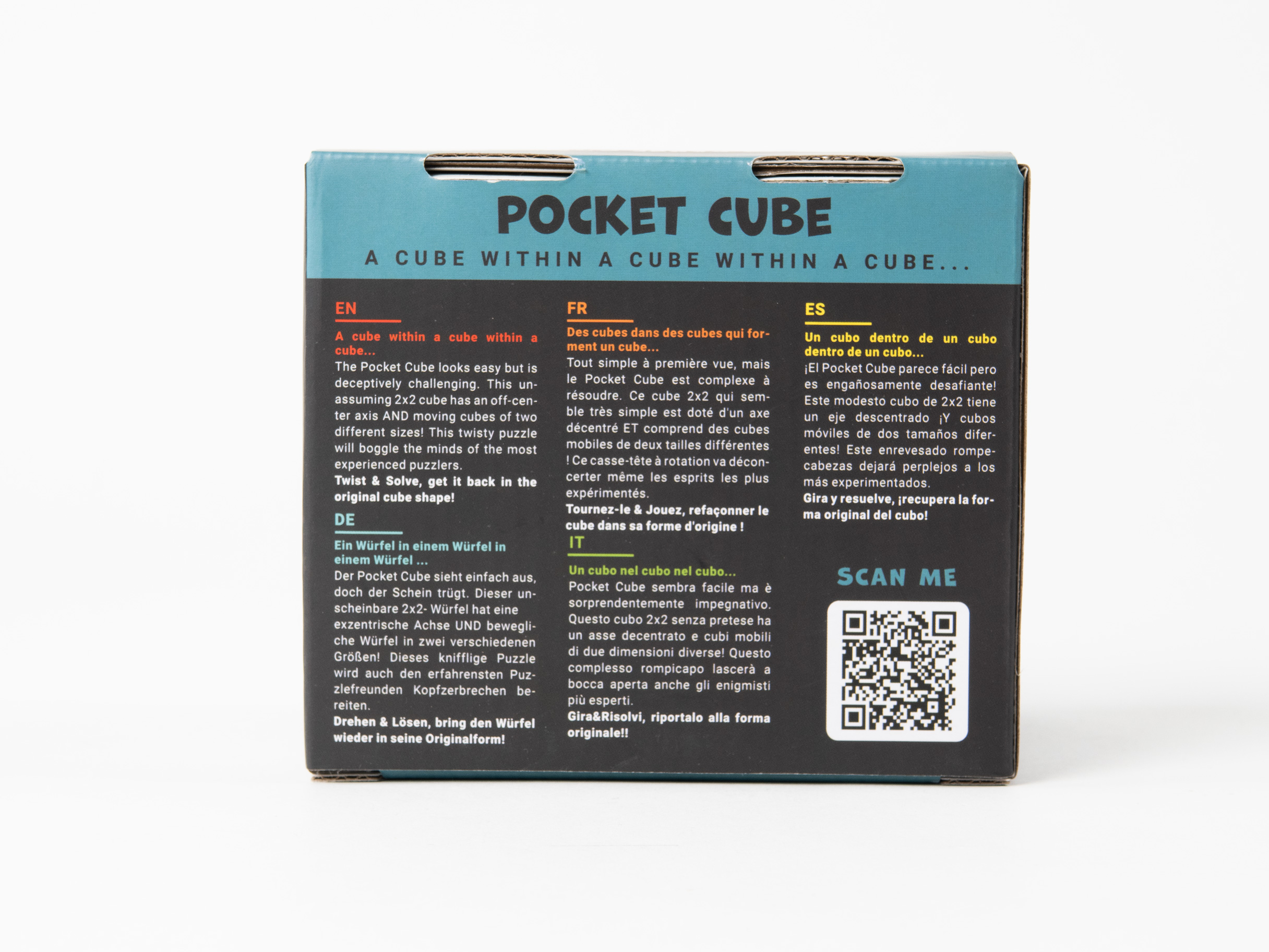 ¡El Pocket Cube parece fácil pero es engañosamente desafiante! Este modesto cubo de 2×2 tiene un eje descentrado ¡Y cubos móviles de dos tamaños diferentes! Este enrevesado rompecabezas dejará perplejos a los más experimentados.