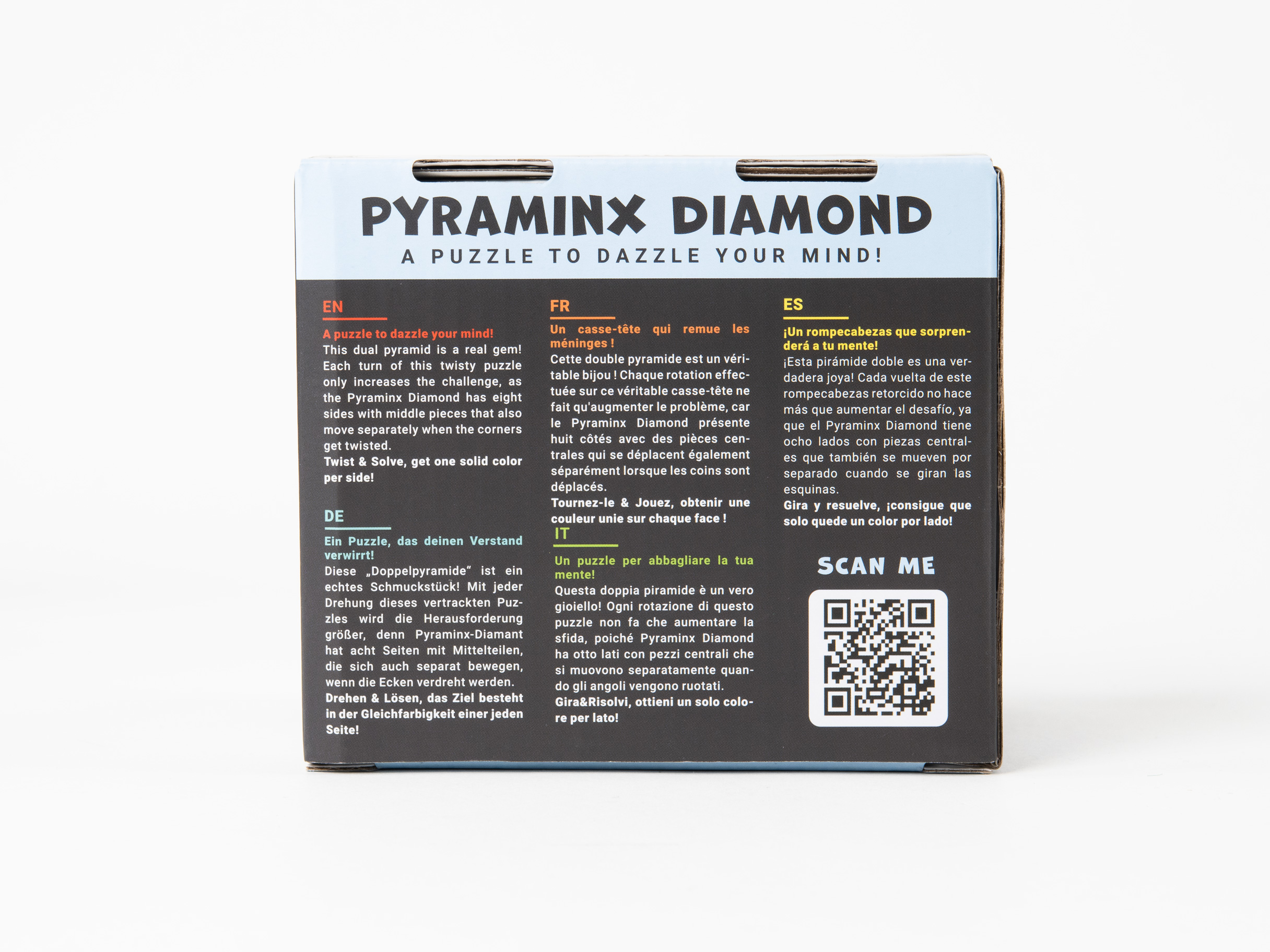 ¡Esta pirámide doble es una verdadera joya! Cada vuelta de este rompecabezas retorcido no hace más que aumentar el desafío, ya que el Pyraminx Diamond tiene ocho lados con piezas centrales que también se mueven por separado cuando se giran las esquinas.