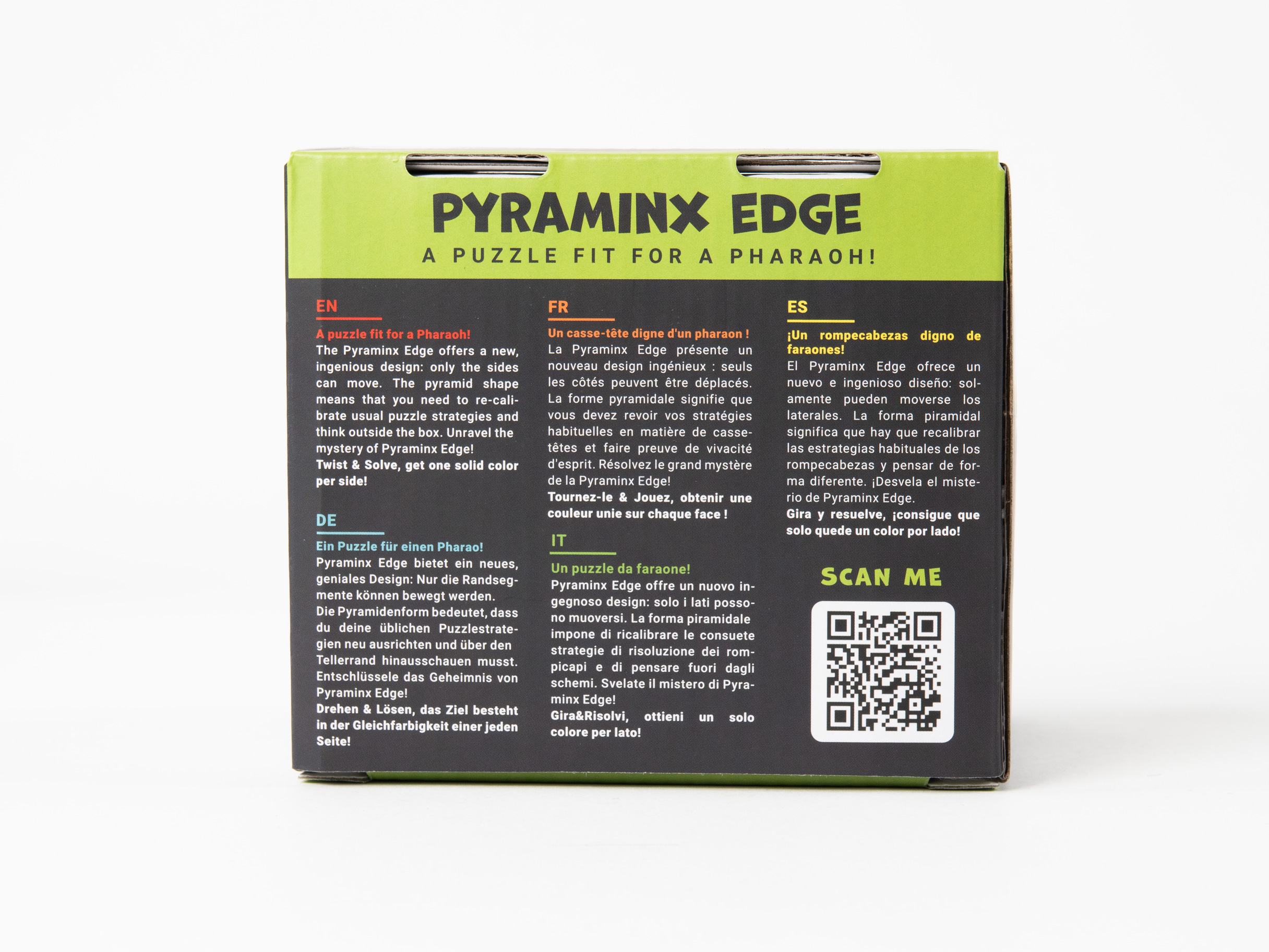 El Pyraminx Edge ofrece un nuevo e ingenioso diseño: solamente pueden moverse los laterales. La forma piramidal significa que hay que re calibrar las estrategias habituales de los rompecabezas y pensar de forma diferente. ¡Desvela el misterio de Pyraminx Edge!